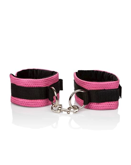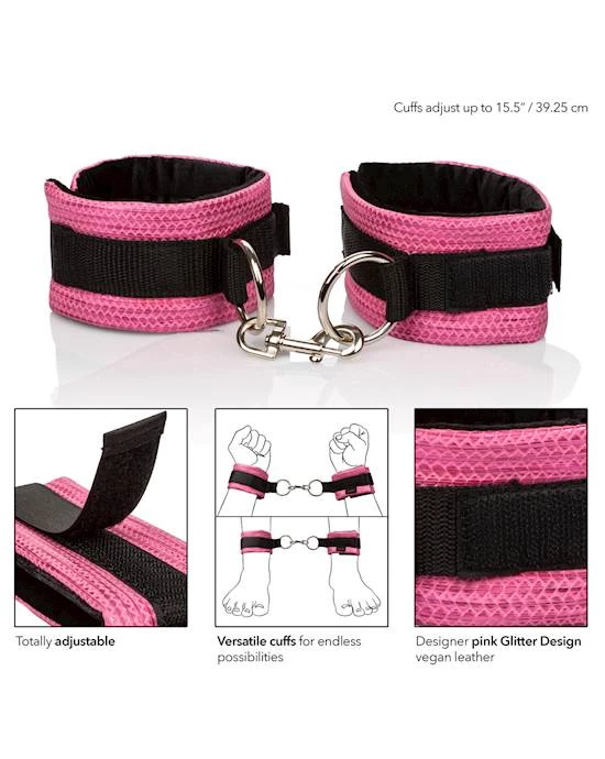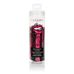 Indulge in sensual submissive play with CalExotics Tickle Me Pink Universal Cuffs. These luxuriously presented cuffs are fully adjustable and can be used for both wrist restraint and ankle restraint. Made of vegan leather and non tarnishing universal hardware, these cuffs will enhance your bedroom experience leaving you at the mercy of your partner.