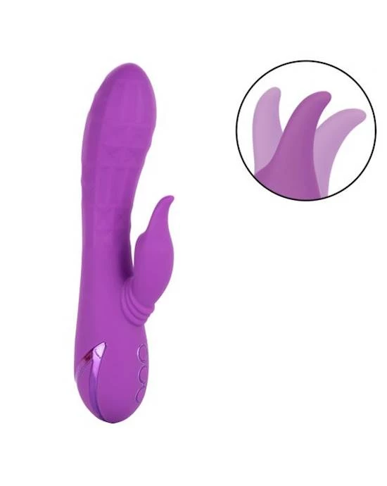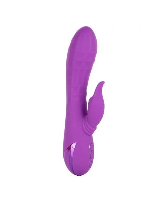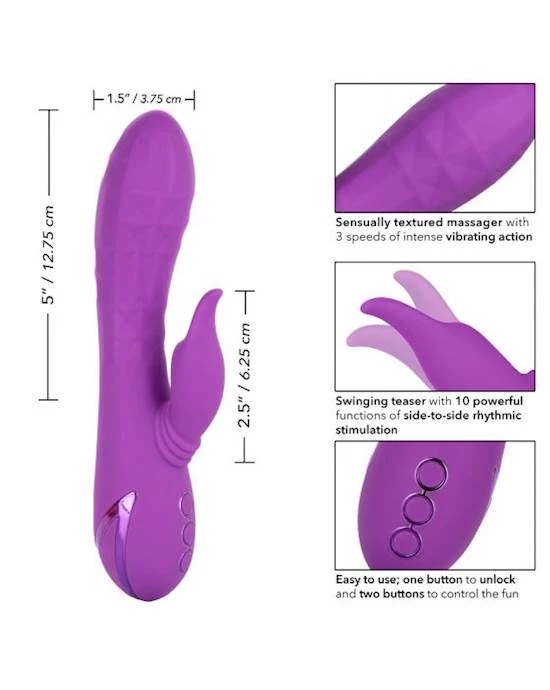 Give yourself over the your wildest fantasies and indulge in true pleasure with the vivacious California Dreaming® Valley Vamp. The luxurious rabbit vibrator has a one-of-a-kind side-to-side rhythmic stimulator for mind-blowing external stimulation. Experience pleasure like never before with the unique swinging teaser and 3 speeds of shaft vibrations.