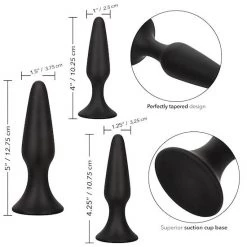 To enjoy everything the exhilarating world of anal play has to offer, training is in order to ensure total safety and satisfaction. Our tapered silicone plugs allow you to gently increase the size of your pleasure as you tease and train. While each increase of your training expands your horizons, use the convenient suction cup base for hands-free stimulation, effortless insertion and gentle removal.