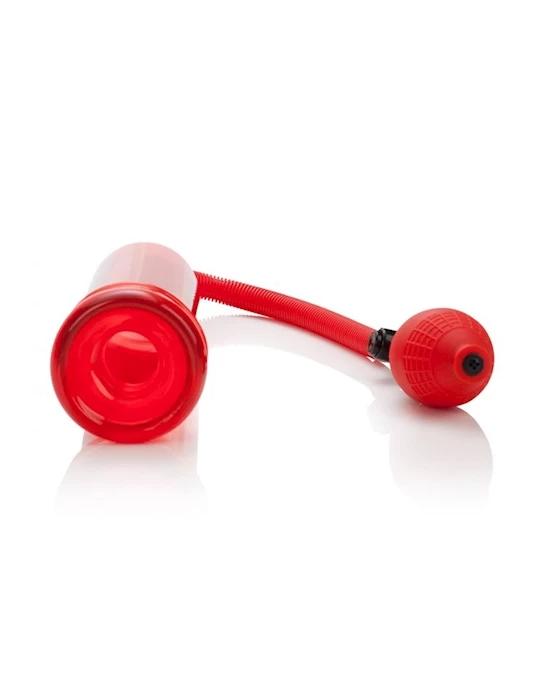 Pumping works using a vacuum that creates an airtight seal around your penis. It uses pressure and increased blood flow to improve your size over time. The bright red bulb makes squeezing your way to a better erection a breeze. Just keep increasing the pressure until you find your level of suction comfort.