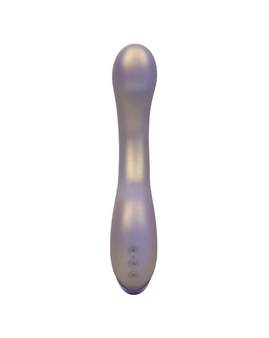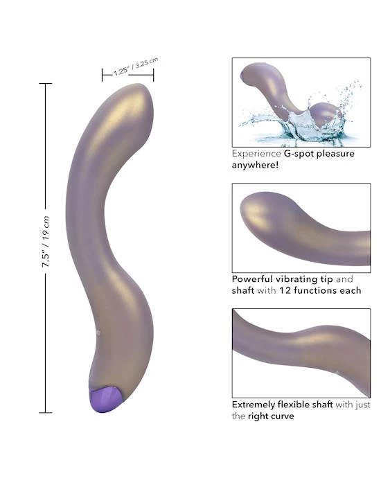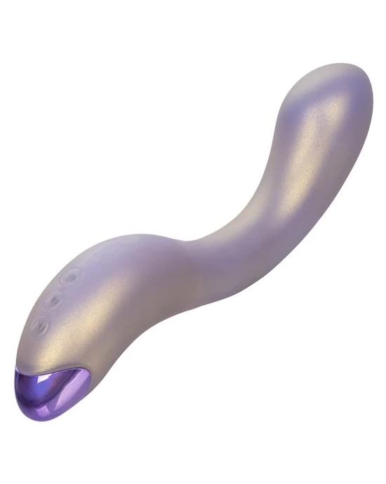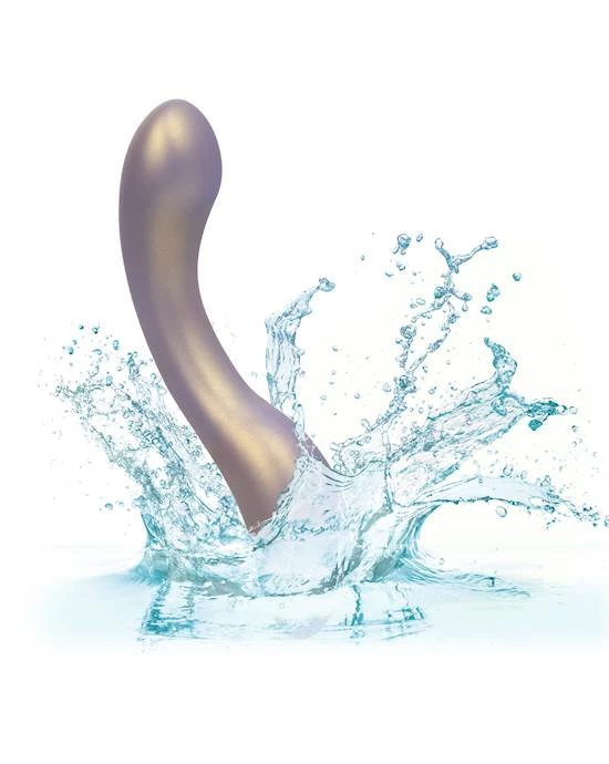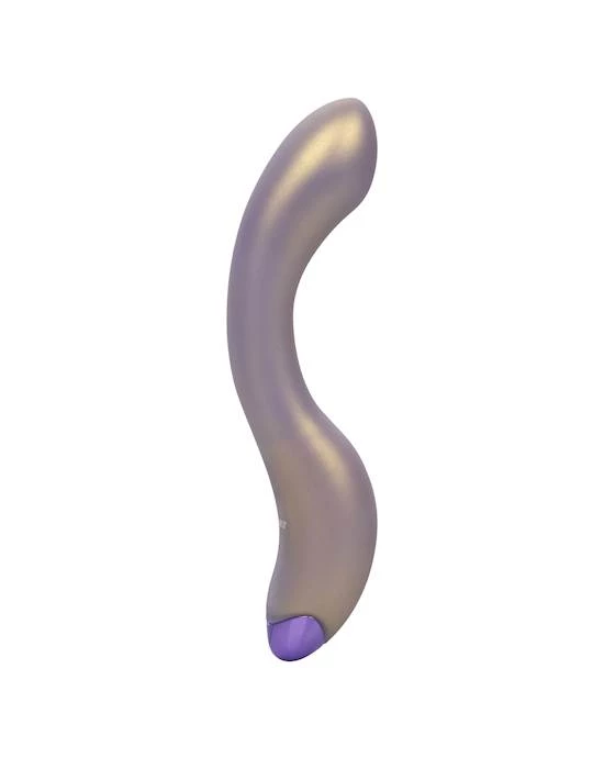 Indulge in personalized pleasure while the curved massager shimmies to the rhythm of 5 sensation speeds of vibration. Control this variety of orgasmic options with the easy-touch control pad. The flexible massager is made from a hygienically superior silicone with dazzling gold plated decorative accents.
