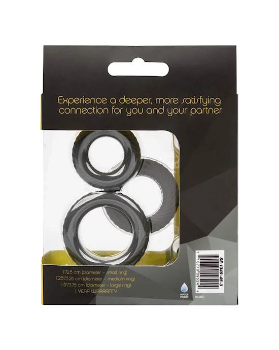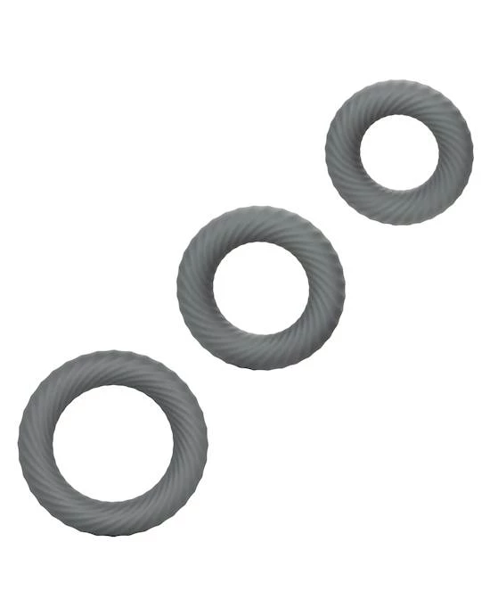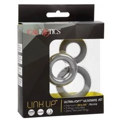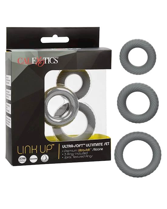 From bashful beginners to erotic experts, the Link Up Ultra-Soft Ultimate Set will wrap you up tight in pleasure with a graduated set of 3 ultra-plush, ultra-stretchy enhancer rings. Each cock ring in this gradually increased in size with a spiral texture pattern for a sensational experience with every wear.