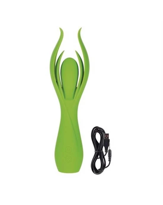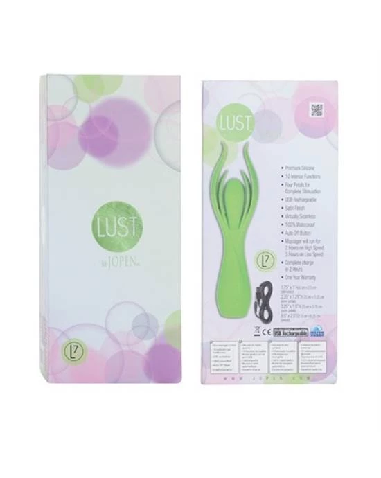 Lust by Jopen L7 Green Silicone Four Petal Massager. Intimately contoured for any woman. Full coverage petals for complete and total arousal. 10 intense functions of vibration, pulsation and escalation. Rechargeable Lithium Ion battery. Rechargeable battery runs for 2 hours on high speed, 3 hours on low speed. Complete charge in 2 hours.