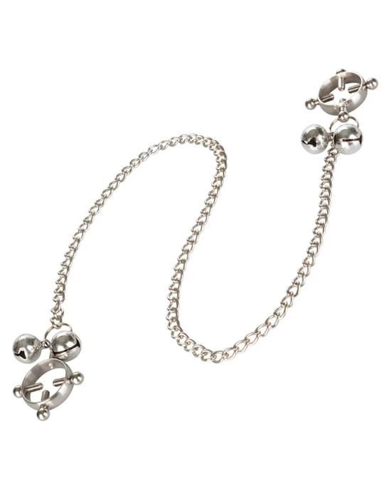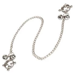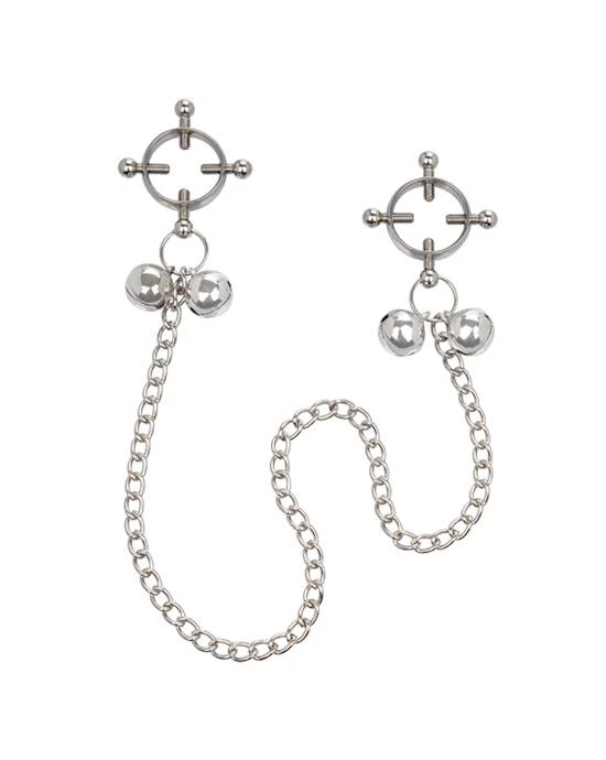Add some fun to your sex life with the Nipple Grips 4-Point Nipple Press with Bells. Heighten your nipple play with a simple twist of the screws. Tighten the screws to exactly the pressure you desire and pull on the chain for a satisfying tugging sensation with the bells ringing with pleasure.