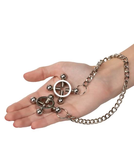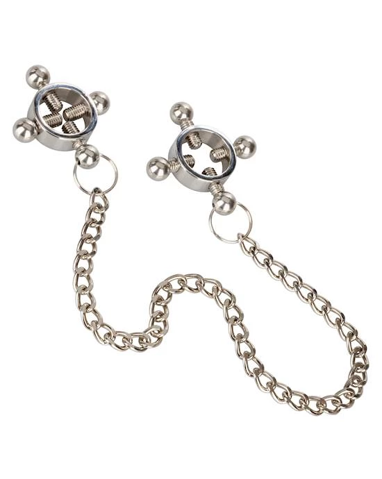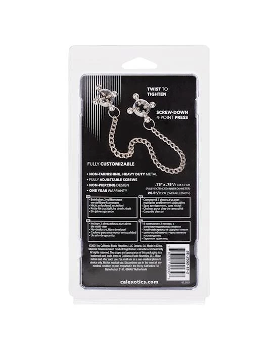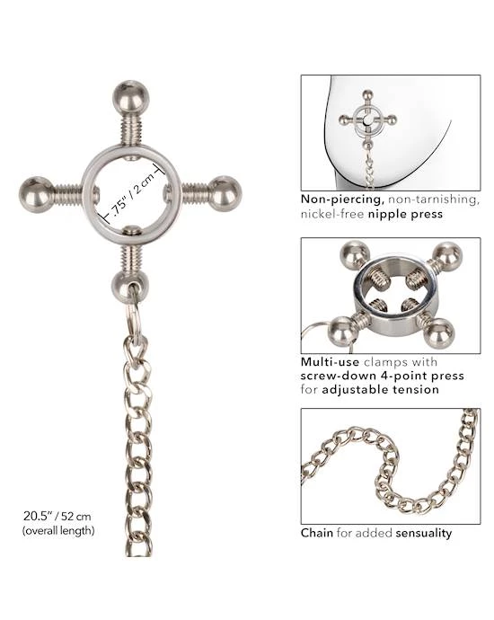 Push sensation to the next level and enjoy teasing nipple play with the Nipple Grips 4-Point Nipple Press with Chain. Explore elevated sensation with the 2 fully adjustable multi use clamps, screw down 4-point press, and teasing chain. Reach new levels of playful pleasure in the screw-down 4-point press with fully adjustable screws. Clamp the naughty clasps to the nipple or anywhere on the body and enjoy every rush of pain and pleasure.