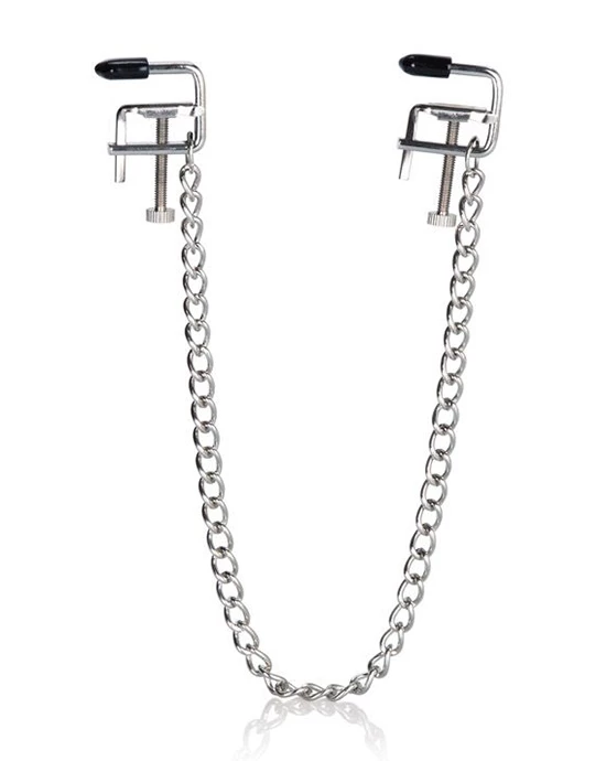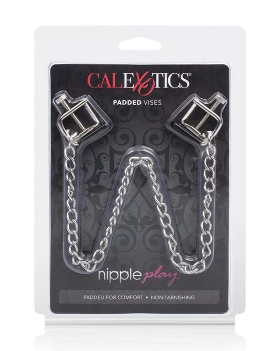 The vises are made from non-tarnishing, nickel-free iron and are attached together via a sturdy, high-quality decorative chain. Each of the clamps measures 1” x 1.25”/2.5 cm x 3.25 cm and has a soft, comfortable phthalate free PVC pad to ensure a pleasurable fit. To adjust the vice like grip simply twist the screws to maximize the seductive tingling sensations. To increase the sensitivity, apply hardening arousal gel to the nipples before attaching the teasing clamps.