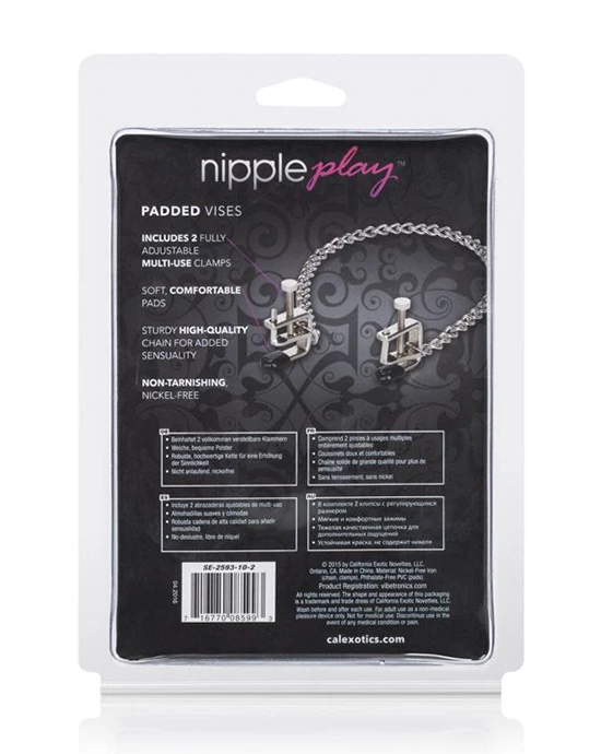 Instantly adjust your pleasure and pain satisfaction with the Nipple Play Padded Vises. The easy to use nipple clamps are comfortable to wear and perfect for erotic and sensual stimulation and pleasure. To experience a new level of orgasmic delight, use the vises to tease and tantalize. The fully adjustable mini nipple clamps are suitable for his and her intense ecstasy.