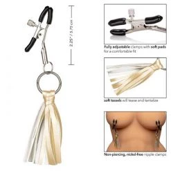 Made with tasteful tassels, these clamps are great for beginners wanting to get into bondage play and enthusiasts alike. Crafted from iron, polyurethane and PVC plastic, these clamps are comfortable and body safe as well as phthalate free.