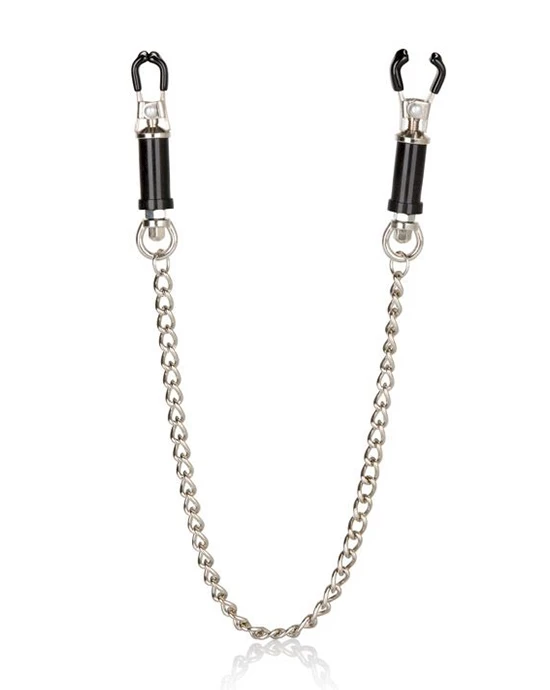 The stimulating clamps are made from non-tarnishing, nickel-free iron and are attached together via a sturdy, high-quality decorative chain. The clamps measure 2.5” x .5”/6.25 cm x 1.25 cm and have soft, comfortable phthalate free PVC pads to ensure a pleasurable fit. The tantalizing and teasing nipple clamps also have a unique swirl design that provides sensual customized tension for increased sensitivity. To maximize the tingling sensations, apply hardening arousal gel to the nipples before attaching the designer clamps.