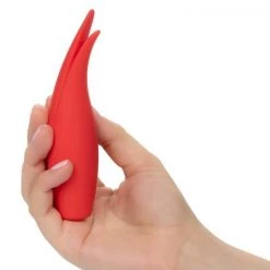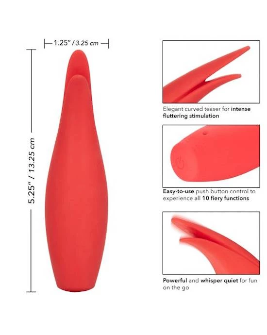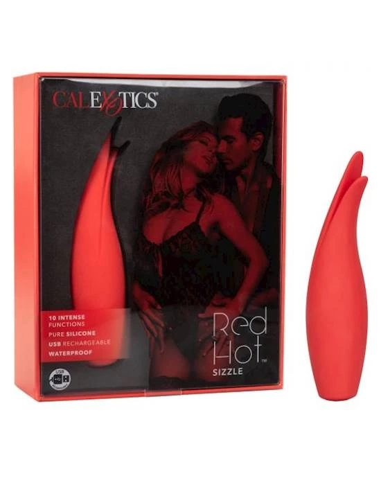 The Red Hot Sizzle is sure to light a fire in your love life with the elegantly curved teaser and 10 powerful vibration functions. The compact travel size, 100% play area and unique body make for a blazing good time. The elegantly curved teaser and 100% play area were crafted to perfectly caress your most sensual sweet spots and deliver fluttering stimulation. The flickering tips and compact size deliver pinpoint pleasure, anywhere you go.