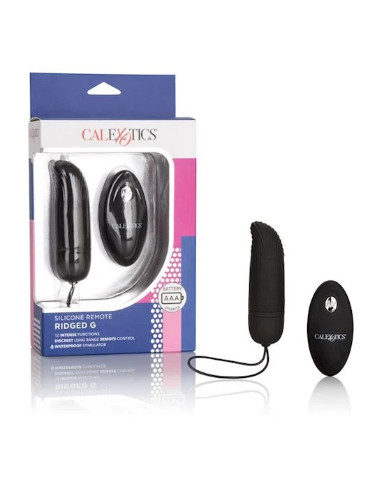 Elevate your intimate playtime fun with the Silicone Remote Ridged G. The erotically contoured and compact massager boasts 12 intense functions of vibration, pulsation and escalation for indulgent arousal, intensified stimulation, and mind-blowing ecstasy.