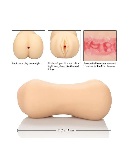 The plush double-ended stroker gives you the best of both worlds with two realistic entry options. No matter which side you choose, the ultra-tight textured chamber creates a wonderland of pleasure for any member willing to slip inside.