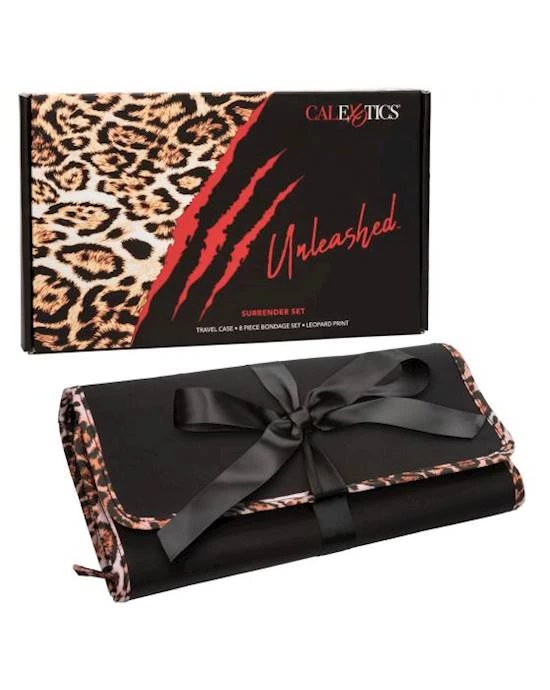 Give yourself over to the thrilling world of submission and dominance with the Unleashed Surrender Set. This travel-ready set includes everything needed to give yourself over to pleasure and your lover’s every erotic whim. This 8-piece kink kit includes a set of 2 fabric ties, double padded eye mask, 2 sets of fully adjustable universal cuffs, collapsible spreader bar, breathable ball gag and roll up travel case with hook.