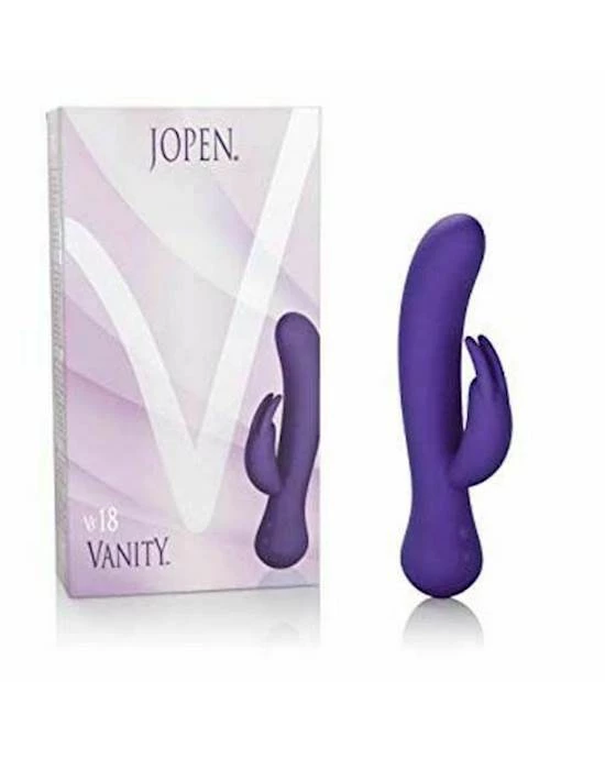 Vanity by Jopen VS18 Rechargeable Premium Silicone Purple Vibrator. Intense incremental speed control. 7 independent functions. Dual motors. USB rechargeable charging cord included. Complete charge in 3 hours.