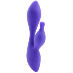 Dramatically swollen at the tip, this g-spot targeting vibe positions its silky shaft naturally against sensitive inner areas. Seven dedicated patterns of steady, pulsating and escalating pleasure are customizable as to intensity- hold down the top button to increase shaft power. Below, a tickle-tipped clitoral stimulator features another seven modes of vibration, activate with the lower button and hold to increase intensity.