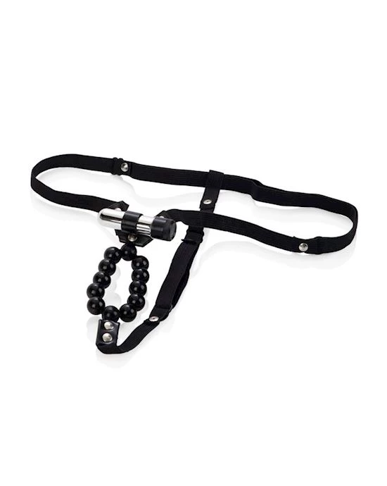 Take your lovemaking to a whole new level with the super sexy, all-embracing Vibrating Lover’s Thong With Stroker Beads, a unique and advanced massage product designed to give both him and her increased pleasure during life’s most romantic moments. Get intimate with your partner, knowing that you have a fun, flirty an exciting new accessory that can turn up the heat for the both of you, providing intense and sensual massage on contact. Designed for mutual stimulation, the pleasure beads give him intense massage while the wireless, removable micro stimulator provide deep pulsations for her.