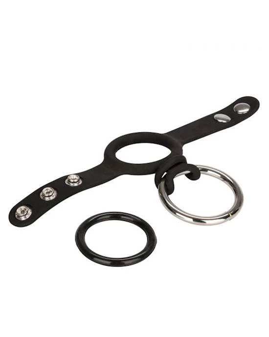 The erotic cock and ball ring set has two interchangeable support rings with a thick adjustable silicone band for an unbeatable customizable fit. The enhanced support is here to increase you and your partners pleasure by increasing stamina, sensitivity and giving the wearer jaw-dropping girth with a wickedly harness strap.
